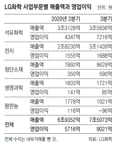 LG화학은 올 3분기 매출액 7조5073억 원, 영업이익 9021억 원을 달성했다고 21일 공시했다. 매출액과 영업이익 모두 사상 최대치다. 매출은 지난해 4분기(7조4510억 원) 기록을 갈아 치웠고, 영업이익은 2011년 1분기 실적(8313억 원)을 깼다.