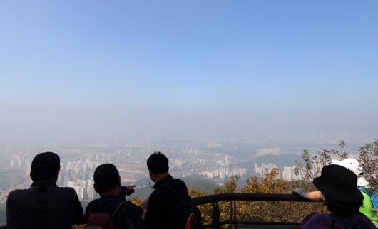 서울 등 수도권 미세먼지 농도가 ‘나쁨’ 수준을 보인 지난 20일 경기 광주시 남한산성에서 바라본 서울 송파·강남구 일대 하늘에 미세먼지가 드리워져 있다. [연합] |
