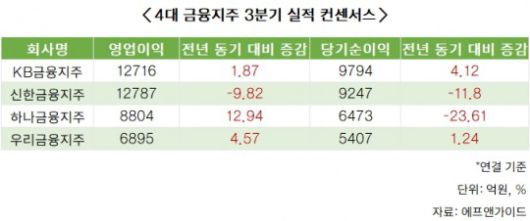 22일 금융정보업체 에프앤가이드에 따르면 올 3분기 신한·KB·하나·우리 등 4대 금융지주의 연결기준 순이익 컨센서스(증권사 추정치 평균)는 총 3조921억원이다. 이는 지난해 3분기(3조2446억원)보다는 4.7% 줄어든 수준이나 전분기(2조6848억원) 대비로는 15.2% 늘어난 수치다.
