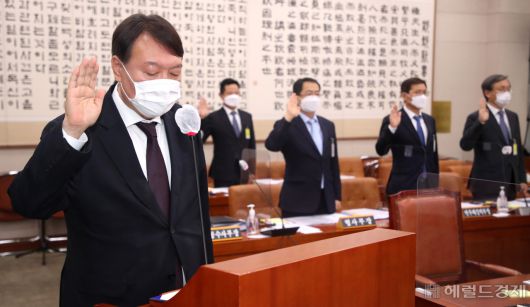 [헤럴드경제=이상섭 기자] 윤석열 검찰총장이 22일 서울 여의도 국회에서 열린 법제사법위원회의 대검찰청에 대한 국정감사에 출석해 선서를 하고 있다. |
