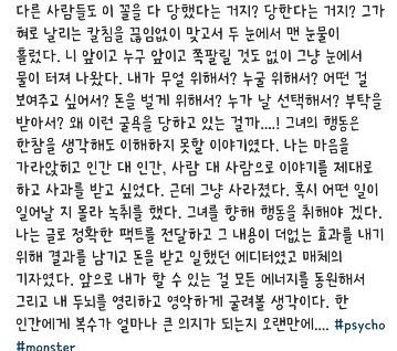 이어 “15년을 이 바닥에서 별의별 인간들을 경험하고는 인생사에 무릎을 꿇었다고 생각했고 이제 거진 내려놓았다 생각했는네 아니었다. 낯선 방에서의 지옥같은 20여분이었다. 완벽히 인사는 생략, 의자에 앉아 서있는 내 면전에 대고 핸드폰을 손에 끼고 삿대질을 하며 말을 쏟아냈다. 나한테 그러는건지 그 방에 있던 모두에게 그러는건지 모를 정도로 흥분 상태였다”라며 당시의 상황을 전했다.