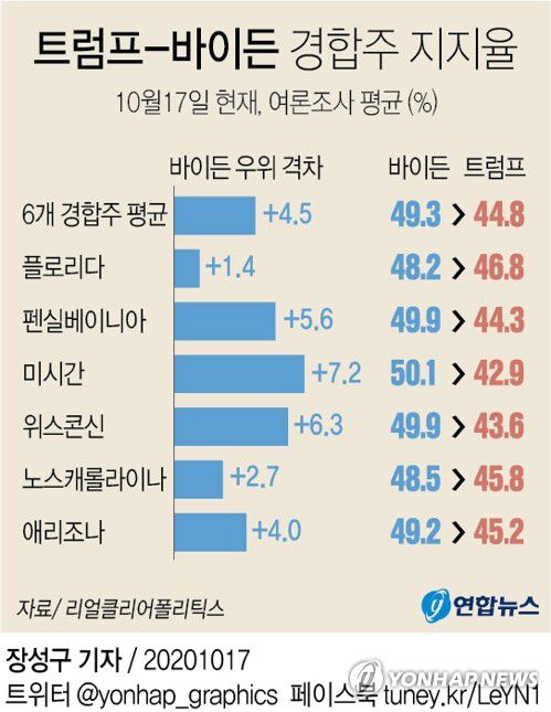 RCP가 지난 1∼14일 진행된 10개 여론조사를 취합한 결과에 따르면 이들 6개 경합주에서 바이든 후보는 트럼프 대통령보다 약 4.9%포인트 앞서고 있다.