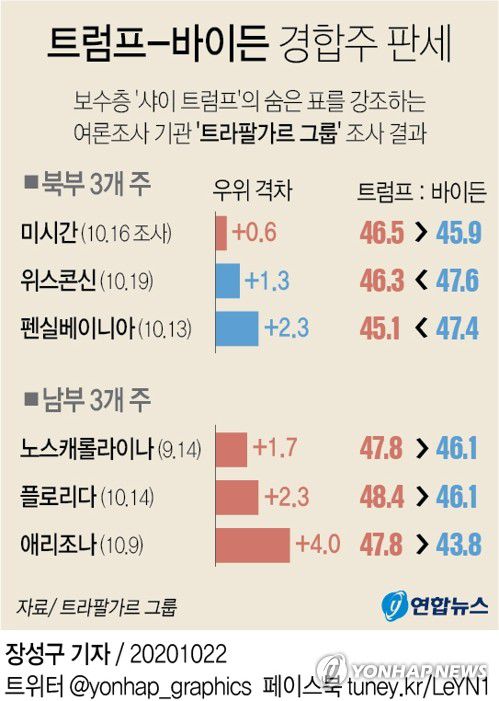 2016년 대선에서 당시 힐러리 클린턴 민주당 후보가 각종 여론조사에서는 우세했지만 실제로 트럼프 후보에게 뼈아픈 일격을 당한 악몽 때문이다. 특히 최근 여론조사에서는 경합주에서 트럼프 대통령이 바이든 후보를 바짝 쫓는 것으로 나타났다.