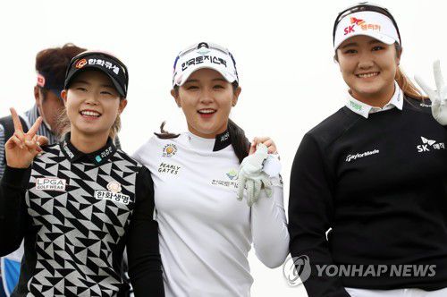 (영암=연합뉴스) 조남수 기자 = 22일 전남 영암 사우스링스 영암 컨트리클럽 카일필립스코스(파72·6천420야드)에서 열린 한국여자프로골프(KLPGA)투어 휴엔케어 여자오픈 1라운드에서 임희정(왼쪽부터), 박현경, 유해란이 1번 홀에서 티삿을 한 뒤 이동하며 카메라를 향해 포즈를 취하고 있다. 2020.10.22 iso64@yna.co.kr <저작권자(c)연합뉴스. 무단전재-재배포금지.>