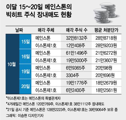 지난 21일 메인스톤의 빅히트 주식 보유 현황과 관련한 공시에 따르면 메인스톤은 빅히트 상장 첫 날인 지난 15일부터 20일까지 하루도 빠지지 않고 빅히트 주식을 장내매도했다.
