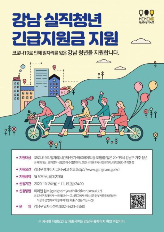 실직청년지원금 신청은 구비서류를 지참해 이메일(gangnamyouth@citizen.seoul.kr)로 접수하면, 심의 후 12월 중순까지 두 차례에 걸쳐 현금으로 지급된다.