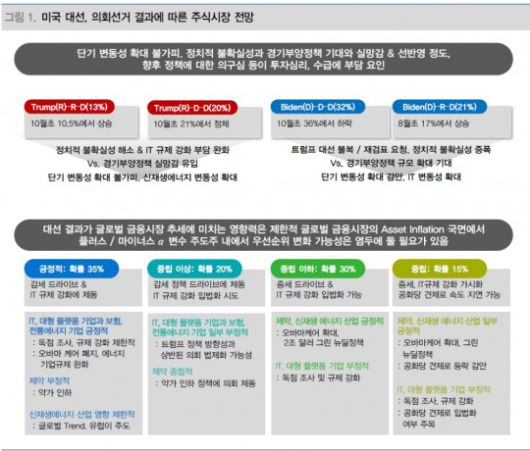 그는 "미국 대선 결과의 단기 영향력은 클 것"이라며 "하지만 중장기적으로는 글로벌 금융시장 Asset Inflation 국면에서 플러스/마이너스 알파 변수로서 영향력을 감안해야 한다"고 밝혔다.