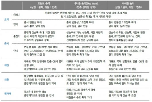 그는 "트럼프와 바이든 후보의 정책정책, 각 정당의 정책 기조를 감안할 때 '트럼프 재선, 공화당 상원 우위'의 경우가 글로벌 금융시장에는 가장 우호적일 것이라고 내다봤다.