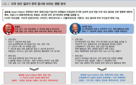 이 연구원은 "트럼프 재선으로 미중 갈등이 고조될 경우 중국 IT 기업 제재는 한국 기업의 반사이익으로 이어질 수 있다"면서 "바이든의 증세, IT 기업규제 강화는 미국 경제/산업 경쟁력 둔화/약화로 인한 달러 약세, 원화 강세 구도, 글로벌 유동성의 Non-US 자산으로 이동을 야기할 수 있다"고 풀이했다.
