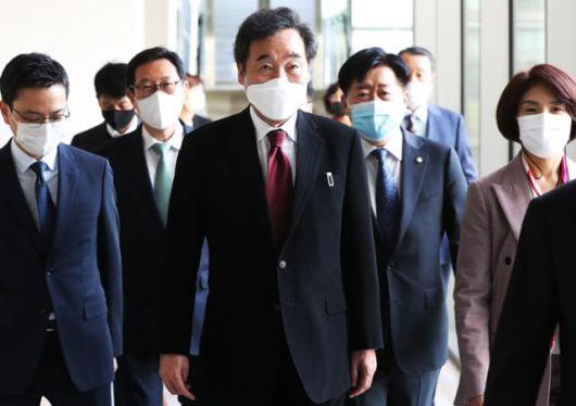 더불어민주당 이낙연 대표가 22일 경기 GC녹십자 RD 센터를 방문해 간담회장으로 이동하고 있다. 연합뉴스 |