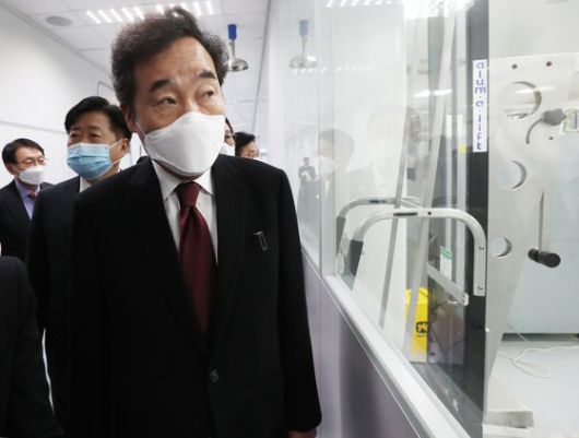 이낙연 더불어민주당 대표가 지난 22일 코로나19 혈장 치료제 개발 현장을 살펴보고 있다. 연합뉴스 |