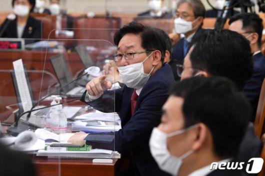 박범계 더불어민주당 의원이 12일 서울 여의도 국회에서 열린 법제사법위원회의 법무부 등에 대한 국정감사에서 국민의힘 의원의 발언과 관련해 항의하고 있다. /사진= 뉴스1 |