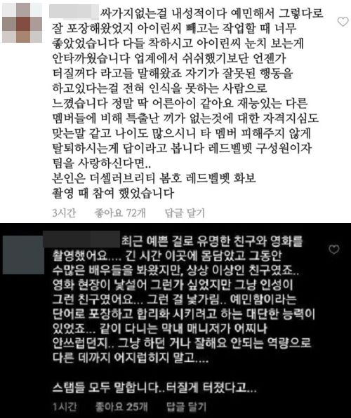 또 이날 아이린이 자신의 인스타그램에 올린 사과문에 자신을 ‘더셀러브리티 봄호 레드벨벳 화보 촬영’에 참여했던 스태프라고 자신을 소개한 B씨는 댓글을 통해 “싸가지 없는 걸 ‘내성적이다’, ‘예민해서 그렇다’로 잘 포장해왔었다”고 언급했다.