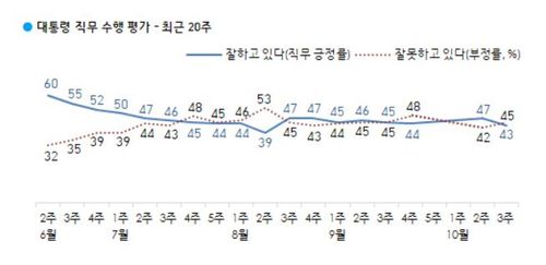 한국갤럽이 지난 20일부터 사흘간 전국 18세 이상 1천1명을 대상으로 조사한 결과 문재인 대통령의 국정수행 지지도는 43%로, 지난주보다 4%포인트 하락한 것으로 나타났다.