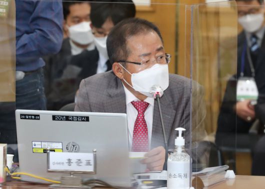 홍준표 무소속 의원이 지난 16일 오전 충남 계룡대에서 열린 국회 국방위원회 육군본부에 대한 국정감사에서 질의하고 있다. 연합뉴스 |