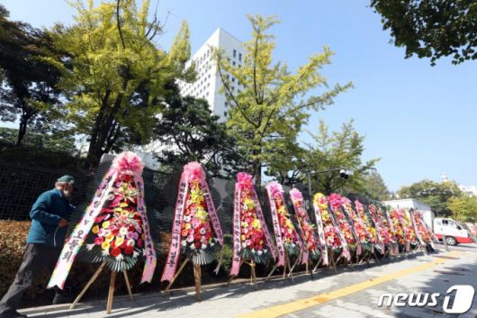 이후 화환의 개수는 점점 더 늘고 있다. 이날 현재 화환은 대검 앞 담벼락 양쪽 끝까지 닿을 정도로 줄지어 서 있다.