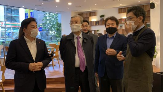 국민의힘 김종인(가운데) 비상대책위원장과 원희룡 제주지사(왼쪽), 정양석 사무총장이 23일 서울 여의도 정치문화플랫폼 하우스(How's)를 방문해 오신환 이사장(오른쪽)의 설명을 듣고 있다./연합뉴스 |
