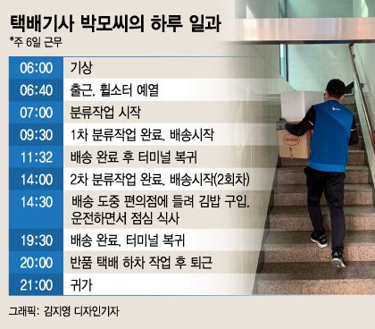 22일 오전 7시 서산의 한 서브 터미널(택배 분류장)에서 만난 박씨는 "끼니 챙길 시간도 없는데 병원을 다녀오는 건 사치"라고 털어놨다. 갓 100일을 넘긴 첫째 아이가 있지만, 하루가 다르게 그의 몸은 나빠지고 있었다.