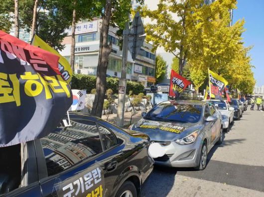 이들은 ‘추미애는 사퇴하라’고 쓰인 깃발과 태극기를 차량에 달거나 ‘법치파괴 국기문란’, ‘추미애는 사퇴하라’ 등의 피켓을 차량 문에 붙였다. 또 ‘엄마가 추미애가 아니라서 미안해’, ‘최재형 감사원장 잘한다’ 등의 피켓도 눈에 띄었다.