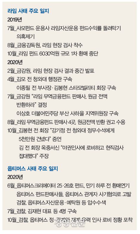 문제의 쌍둥이 사건 ‘라스(라임자산운용·옵티머스자산운용)’는 펀드의 세부 구조가 비공개되는 사모펀드에서 발생했고, 정·관계 로비가 얽혀 있다는 점이 같다. 저금리에 매력적인 수익성도 시중 유동성을 자극했다는 점도 비슷하다. 라임자산운용은 부실 펀드의 자산을 멀쩡한 다른 펀드 자금으로 사들이며 수익이 계속 나는 것처럼 포장했고, 옵티머스자산운용은 아예 보유하지 않은 자산을 내세워 투자 자금을 끌어모은 뒤 부실 사모사채에 투자하거나 부동산 개발에 썼다. 총 2조1000억원대 환매 중단 사태를 야기한 두 사건은 한국 금융정책과 규제의 한계 및 금융인의 도덕적 해이를 여실히 보여준 ‘금융흑역사’로 기억될 것이 분명하다.