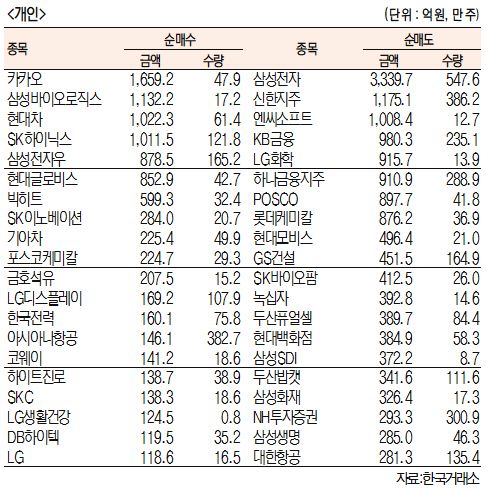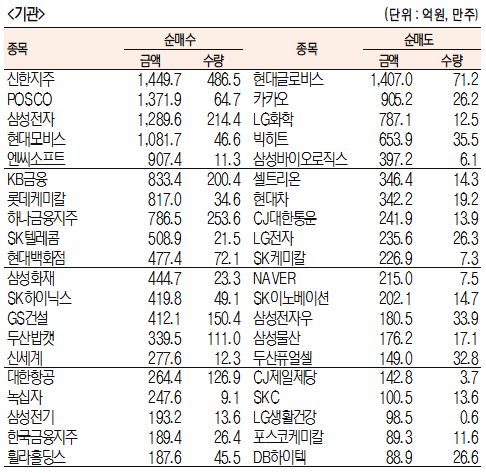 [표]주간 유가증권 기관·외국인·개인 순매수·도 상위종목(10월 19일~23일)