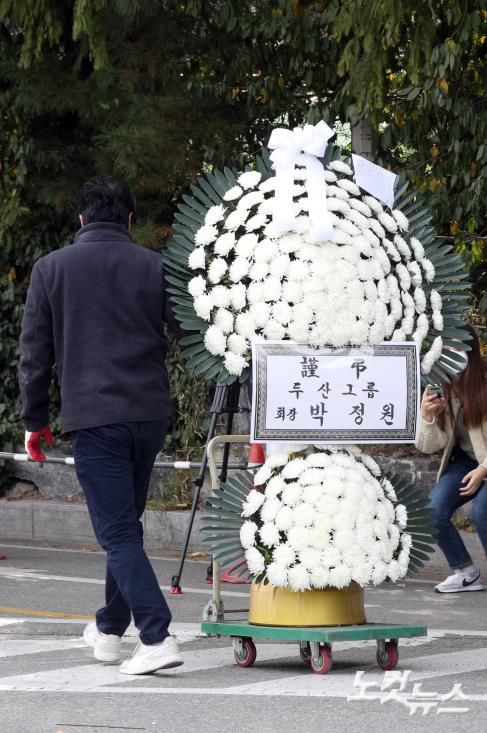 이건희 삼성그룹 회장이 별세한 25일 서울 강남구 삼성서울병원 장례식장에 박정원 두산그룹 회장이 보낸 근조화환이 도착하고 있다. 2020.10.25/뉴스1