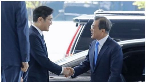 문재인 대통령이 지난 2019년 10월 10일 오전 충남 아산시 삼성디스플레이 아산공장에서 열린 삼성디스플레이 신규 투자 및 상생협력 협약식에 도착, 이재용 부회장과 인사하고 있다. 연합뉴스 |