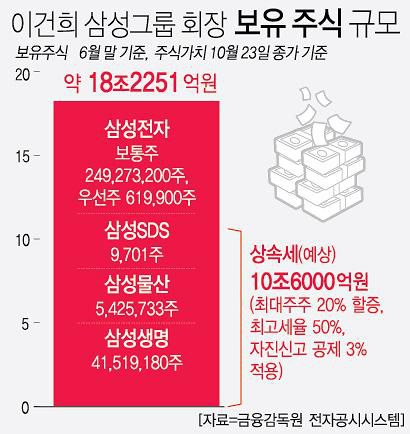 25일 재계에 따르면 이 회장이 보유한 삼성그룹 주식은 시가로 18조원이 넘는 규모다. 이 회장은 삼성전자 보통주 2억4927만3200주(지분율 4.18%)와 우선주 61만9900주(0.08%), 삼성생명 4151만9180주(20.76%), 삼성물산 542만5733주(2.86%), 삼성SDS 9701주(0.01%) 등을 보유하고 있다.
