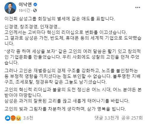 이낙연 더불어민주당 대표가 지난 25일 이건희 삼성전자 회장의 별세를 애도하며 공과 과를 담은 글을 페이스북에 올리자 비판 댓글이 잇따르고 있다.