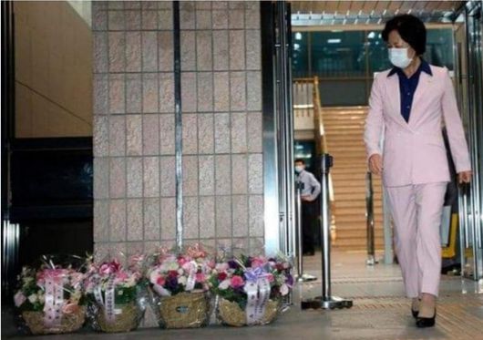 그러면서 진 전 교수는 꽃다발 바구니를 바라보면서 문을 나서는 추미애 법무부 장관의 사진을 함께 올렸다.
