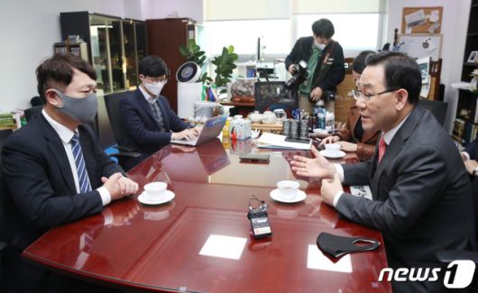 최재성 청와대 정무수석(왼쪽)이 26일 오전 서울 여의도 국회 의원회관 국민의힘 주호영 원내대표 사무실을 찾아 주호영 원내대표와 면담을 하고 있다. 주 원내대표는 이날 '다시 대통령에게 드리는 10가지 질문'이라고 써진 서신을 넣은 서류봉투를 전달했다/사진=뉴스1 |