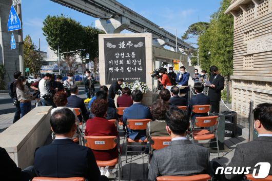 (대구=뉴스1) 남승렬 기자 = 삼성과 각별한 인연이 있는 대구의 주민과 인사들이 26일 중구 인교동 크레텍책임 본사 앞에서 고(故) 이건희(1942~2020) 삼성그룹 회장 추모식을 열고 고인을 추모하고 있다. 인교동은 이 회장이 태어난 생가가 있는 곳이며 추모식이 열린 크레텍책임 앞 터는 오늘의 일류기업 삼성을 있게한 '삼성상회'가 있었던 자리다. (중구청 제공) 2020.10.26/뉴스1