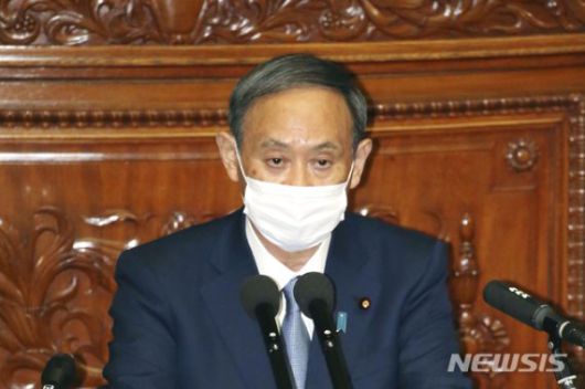 스가 요시히데 일본 총리가 26일 도쿄 중의원에서 열린 제203차 임시국회 본회의에서 연설을 하고 있다.뉴시스 |
