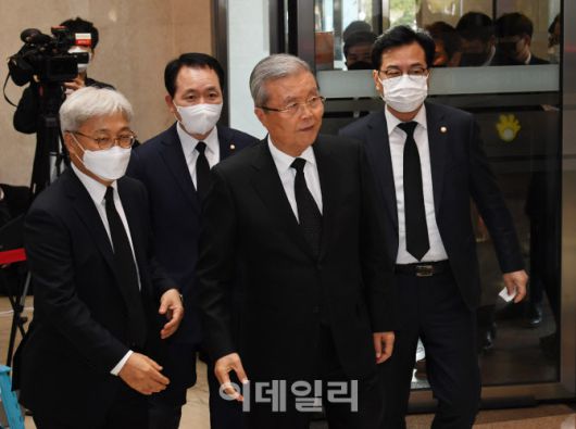 [사진공동취재단] 김종인 국민의힘 비대위원장(왼쪽 세번째)이 26일 오후 고 이건희 삼성그룹 회장 빈소가 마련된 서울 강남구 삼성서울병원 장례식장에 들어서고 있다.