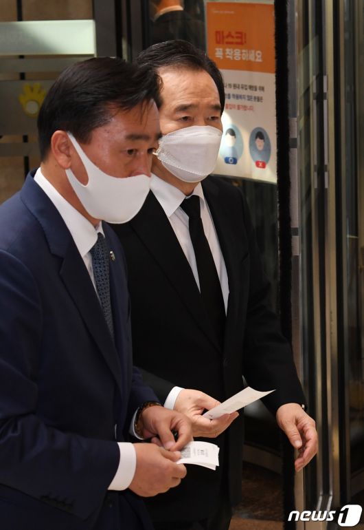 (서울=뉴스1) 사진공동취재단 = 정세균 국무총리(오른쪽)가 26일 오후 고 이건희 삼성그룹 회장 빈소가 마련된 서울 강남구 삼성서울병원 장례식장에 들어서고 있다. 2020.10.26/뉴스1photo@news1.kr[© 뉴스1코리아(news1.kr), 무단 전재 및 재배포 금지]