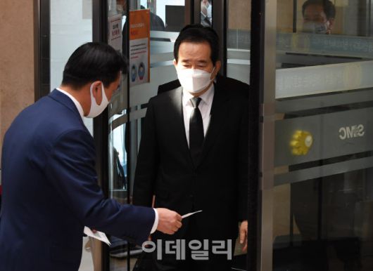 [사진공동취재단] 정세균 국무총리(오른쪽)가 26일 오후 고 이건희 삼성그룹 회장 빈소가 마련된 서울 강남구 삼성서울병원 장례식장에 들어서고 있다.
