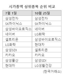 26일 한국거래소에 따르면 지난 7월 1일과 현재 증시를 비교했을 때 시총 상위종목 10개(우선주 제외) 중 7개의 순위가 변동됐다. 대장주의 지위를 지키고 있는 삼성전자와 SK하이닉스가 1, 2위를 기록한 가운데 카카오가 8위를 유지했다.