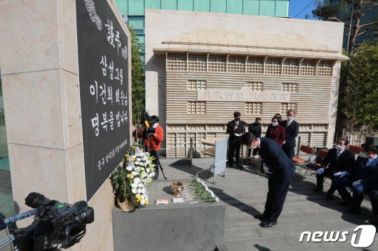 (대구=뉴스1) 남승렬 기자 = 삼성과 각별한 인연이 있는 대구의 주민과 인사들이 26일 중구 인교동 크레텍책임 본사 앞에서 고(故) 이건희(1942~2020) 삼성그룹 회장 추모식을 열고 고인을 추모하고 있다. 인교동은 이 회장이 태어난 생가가 있는 곳이며 추모식이 열린 크레텍책임 앞 터는 오늘의 일류기업 삼성을 있게한 '삼성상회'가 있었던 자리다. (중구청 제공) 2020.10.26/뉴스1