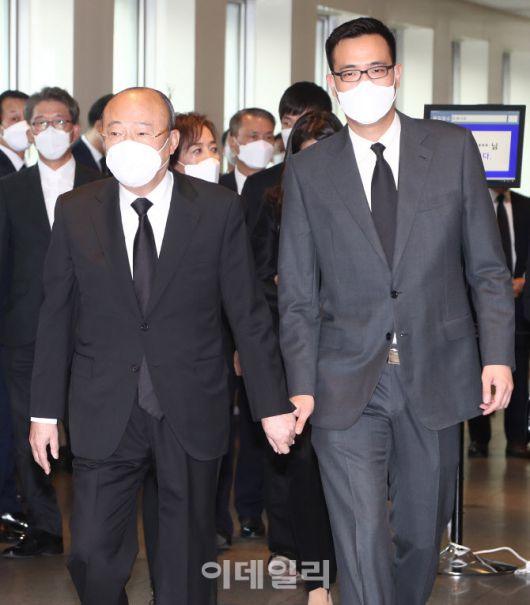 [사진공동취재단] 김승연 한화그룹 회장과 김동선 전 한화건설 팀장이 26일 오후 고(故) 이건희 삼성 회장의 빈소가 마련된 서울삼성병원 장례식장에서 조문을 마친 뒤 나서고 있다.