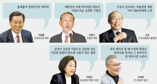 경영인들에게 이 회장은 '전설' 그 자체로 다가온다. 허창수 전국경제인연합회 회장(GS건설 회장)은 이 회장을 "당신은 영원한 1등"이라고 추모했다. 허 회장은 전날 경제단체 수장으로서는 유일하게 별도로 7쪽 분량의 추도사를 썼다. 그는 이 회장을 '승부사' '개혁가' '완벽주의자' '애국경영인' 등으로 묘사했다.