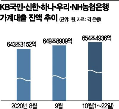 KB국민ㆍ신한ㆍ하나ㆍ우리ㆍNH농협 등 5대 시중은행의 이달 22일 현재 가계대출 잔액은 654조4936억원으로 9월 말(649조8909억원)보다 4조6027억원 늘었다. 아직 이달 영업일이 남아있기는 하지만 증가폭이 지난달(6조5757억원) 대비 30%, 사상 최대폭으로 증가했던 8월(8조4098억원) 대비 45%나 줄어 감소세가 확연하다는 평가다.