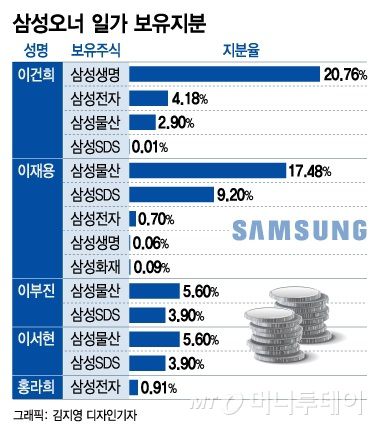 삼성물산은 삼성전자 지분 5.01%와 삼성생명 지분 19.34%를 보유한 사실상 삼성그룹의 지주사다. 이 부회장은 삼성물산 지분 17.48%를 보유한 최대주주다. 이부진 호텔신라 사장(5.60%), 이서현 삼성복지재단 이사장(5.60%), 이 회장(2.90%) 등 이 부회장 일가 소유의 삼성물산 지분은 31.90%에 달한다.