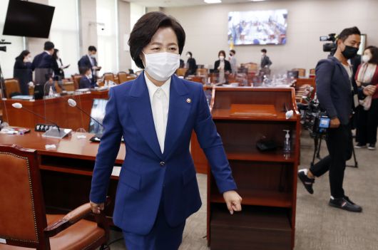 추미애 법무부 장관이 지난 26일 서울 여의도 국회에서 열린 법제사법위원회의 법무부, 대법원, 감사원, 헌법재판소, 법제처에 대한 종합감사가 정회되자 감사장을 나가고 있다. [연합] |