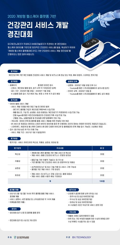[헤럴드경제] (주)디케이아이테크놀로지(대표 허경수)와 (재)대구테크노파크(원장 권업)가 ‘2020 개발형 헬스케어 플랫폼 기반 건강관리 서비스 개발 경진대회’를 개최, 대회 참가자를 내달 말까지 모집한다.