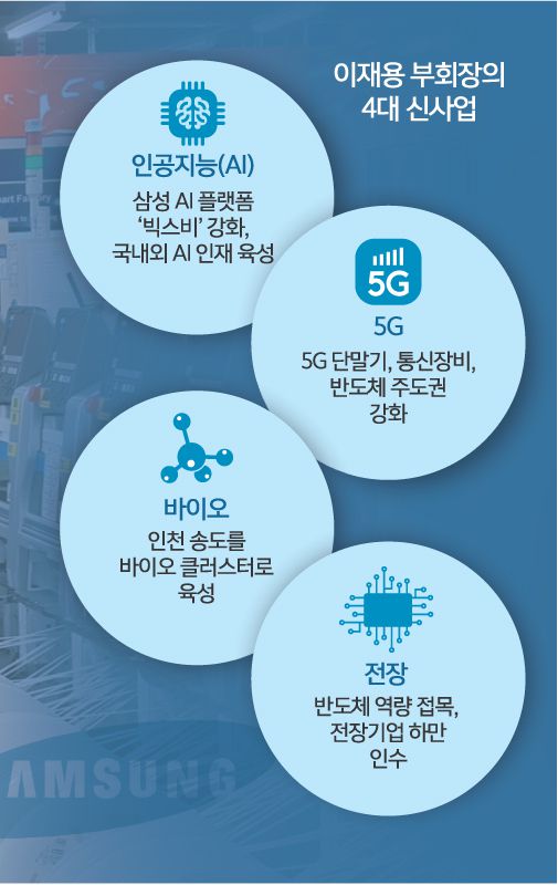 지난 6년간 이 부회장의 경영 행보를 살펴보면, 향후에도 굵직한 M&A(인수합병)와 투자로 그룹 전반의 변화를 꾀할 것으로 보인다. 이 부회장의 경영 기조는 2018년 발표한 경제 활성화 및 신산업 육성 계획에서 엿볼 수 있다. 당시 이 부회장은 3년간 180조원의 투자 계획과 함께 미래 4대 신사업으로 ‘인공지능(AI)’, ‘5G(5세대 이동통신)’, ‘바이오’, ‘전장’을 꼽았다. 불과 3년이 지났지만 4가지 신사업 모두 삼성그룹 내에서 괄목할 만한 성장세를 보이고 있다.