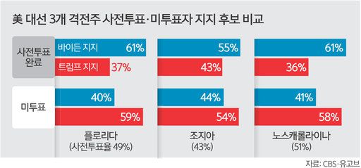 CBS방송·유고브가 지난 20~23일 3개 격전지에서 실시해 전날 공개한 여론조사 결과를 보면, 플로리다 사전투표자 가운데 61%가 바이든 후보를 지지해 트럼프 대통령(37%)을 크게 앞섰다. 노스캐롤라이나에서도 바이든 후보 지지(61%)가 트럼프 대통령(36%)보다 높았다. 조지아에서 바이든 후보와 트럼프 대통령 지지 응답은 각각 55%, 43%였다.