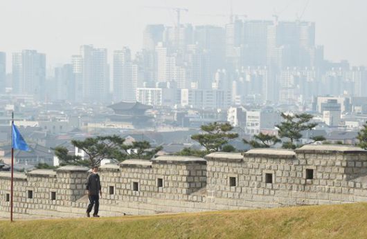 수도권에 미세먼지 농도가 '나쁨' 수준을 보인 지난 27일 경기 수원화성 연무대에서 바라본 수원 도심 일대. 뉴시스 |
