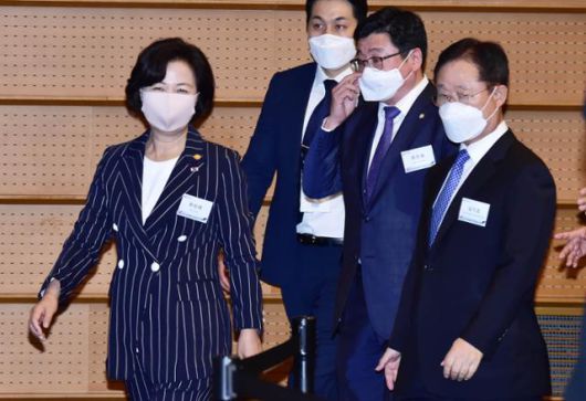 6월 25일 대한상의 국제회의장에서 고위공직자범죄수사처설립준비단 주최로 열린 '선진수사기구로 출범하기 위한 공수처 설립방향' 공청회에서 추미애 법무장관(왼쪽부터), 이찬희 대한변협회장, 남기명 공수처준비단장이 입장하고 있다. 고영권 기자 |