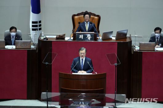 [서울=뉴시스]박영태 기자 = 문재인 대통령이 28일 서울 여의도 국회 본회의장에서 2021년도 예산안 시정연설을 하고 있다. 2020.10.28. since1999@newsis.com |