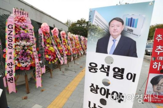 [아시아경제 강주희 기자] 윤석열 검찰총장을 응원하는 화환이 서울 서초구 대검찰청 앞에 300개 넘게 설치된 가운데 서초구가 화환들을 강제 철거하겠다고 공지하면서 이를 둘러싼 갈등이 예상된다.